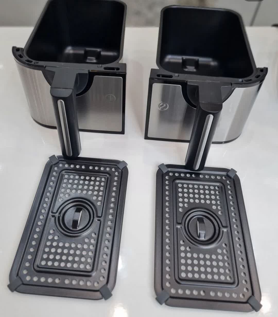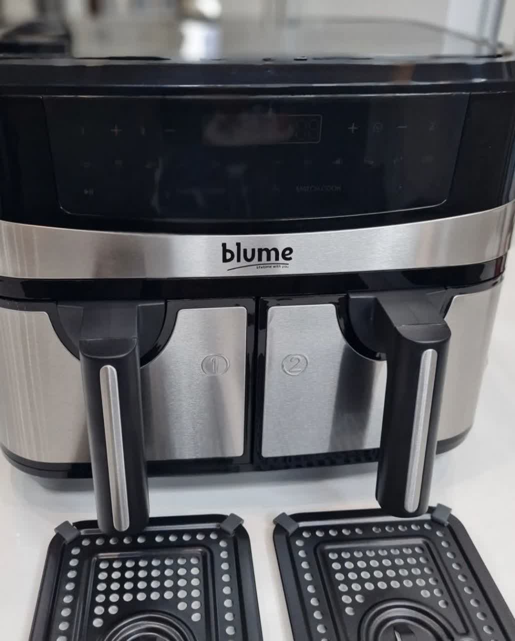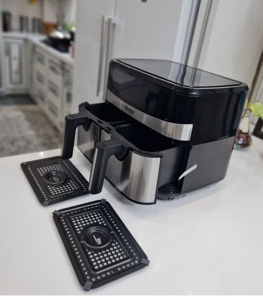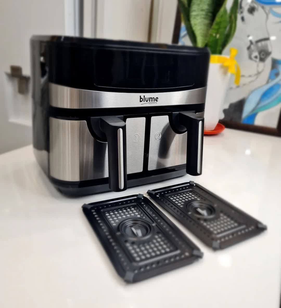 سرخکن دوقلو رژیمی بلوم آلمان، نسل جدید لوازم آشپزخانه با فناوری گردش هوای گرم. دو محفظه مستقل، کنترل دیجیتال لمسی و طراحی حرفهای برای پخت بدون روغن.